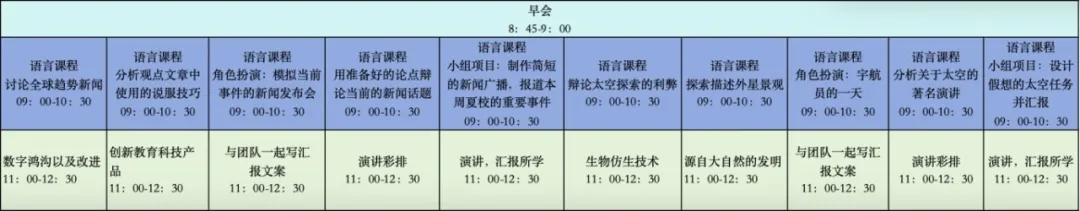 每周15小时的学术课程,由经验丰富的学科导师通过互动和实践课程进行授课;在课程和活动中学习和应用英语,提高学生的听说能力